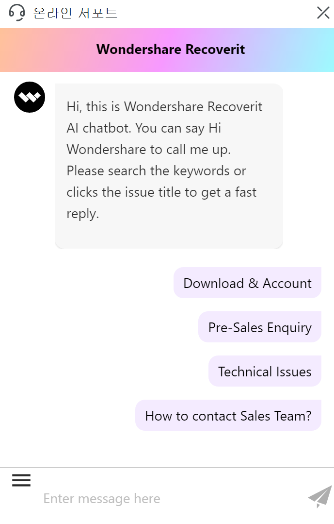 Recoverit 프로그램을 띄우시면 위쪽 상단에 헤드폰 모양의 아이콘이 있습니다.